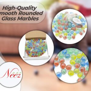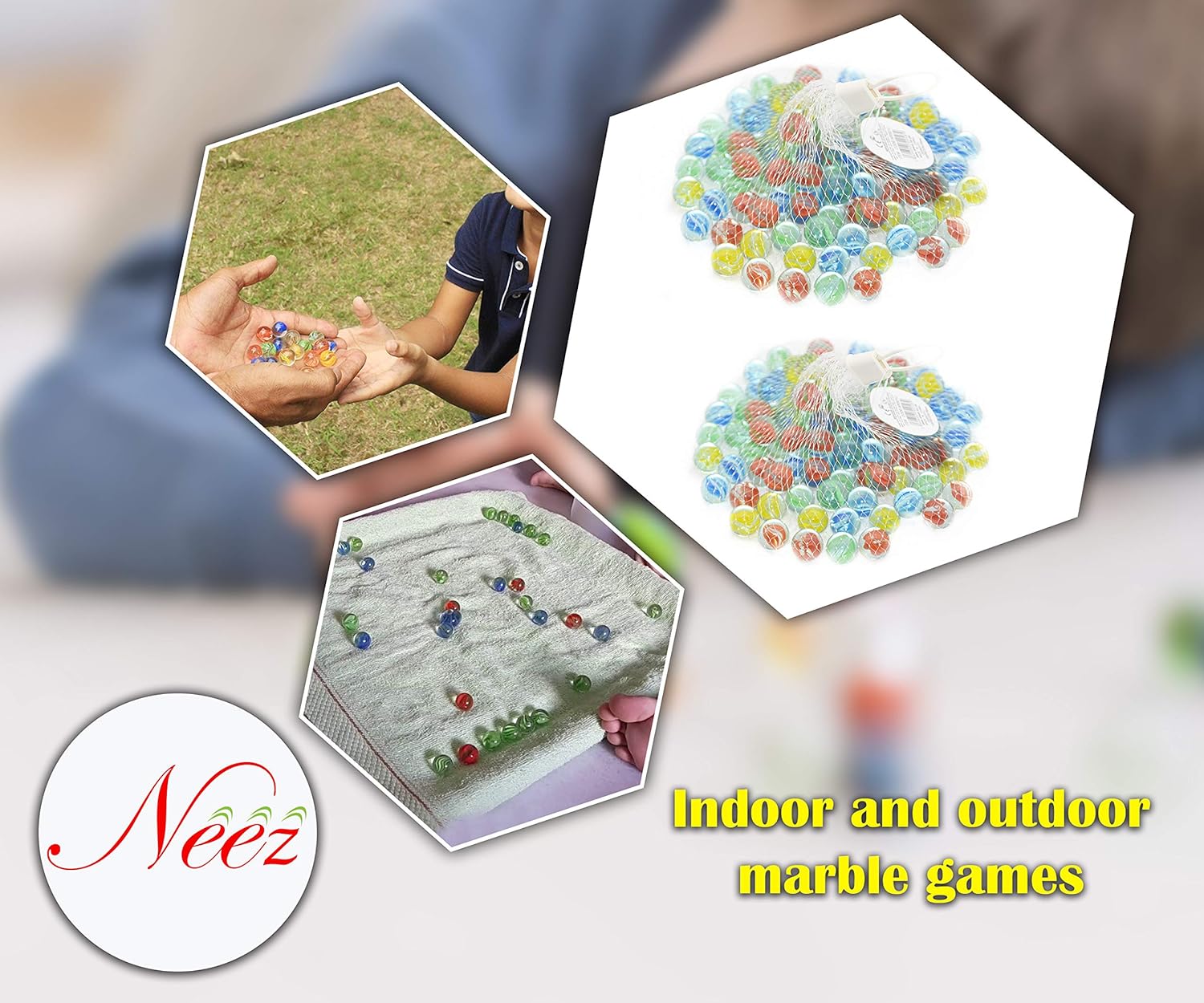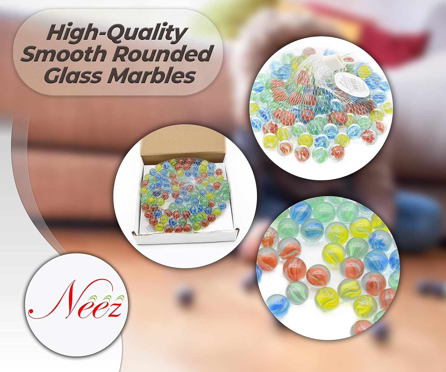 CONTENT: 160-170Pcs, 955gm Approx. of traditional design and colored glass marbles of the same size and mesh bags in a white cardboard packaging