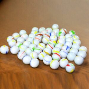 Contents – 160-170Pcs, 955gm Approx. of wonderful design and assorted milky glass marbles with the same size and colour comes in a net bag inside a white cardboard package